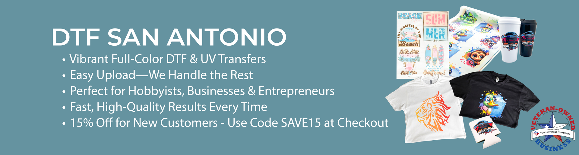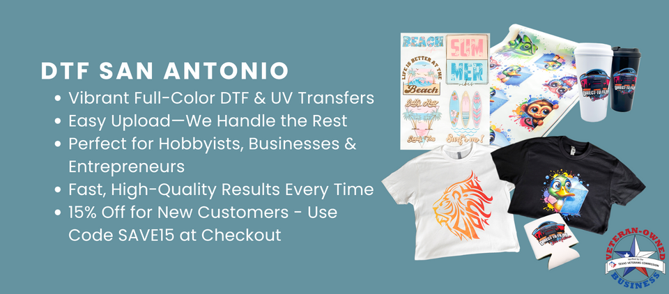 DTF San Antonio provides high-quality Heat and UV DTF Transfers in San Antonio, TX. We deliver vibrant, full-color prints for hobbyists, entrepreneurs, and businesses.